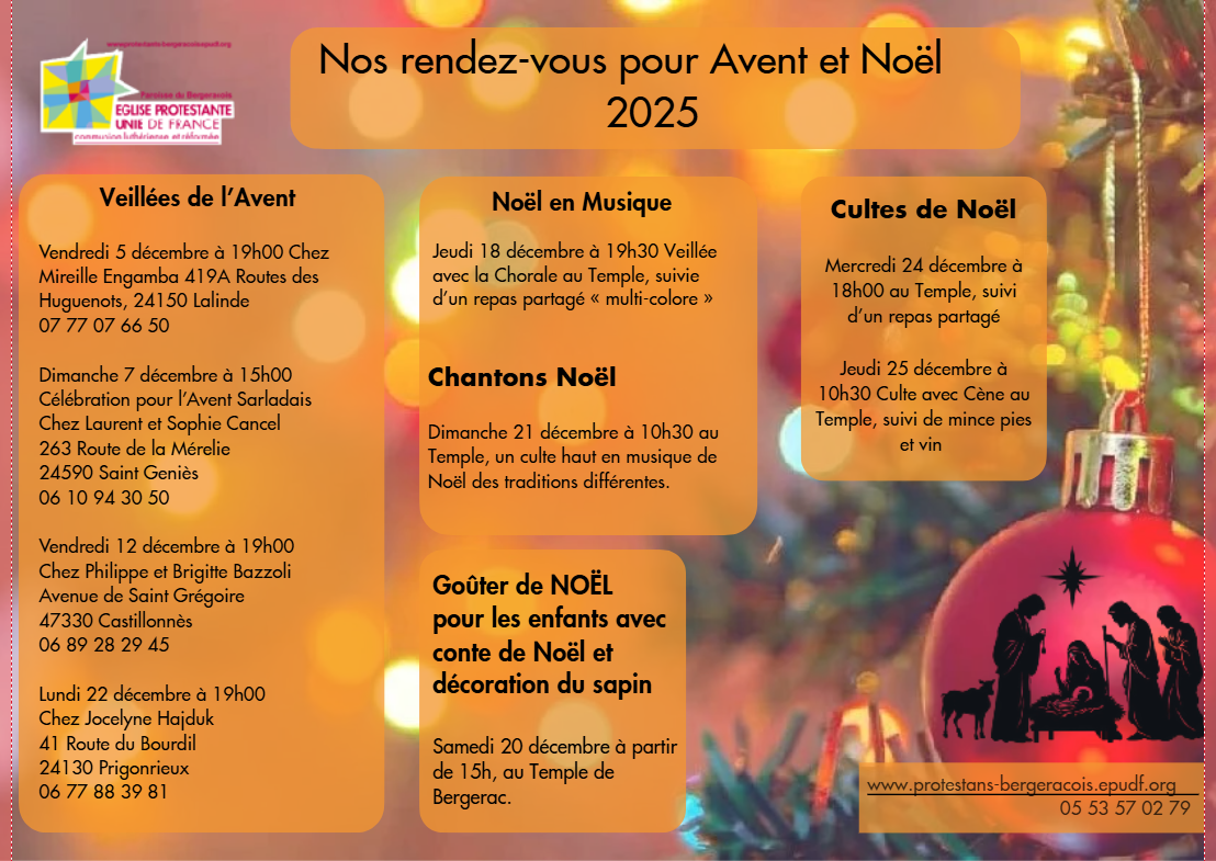 Culte de Noël au Temple de Bergerac. Culte suivi d’un repas partagé. Contactez Henriette Dufour pour en savoir plus au 06 81 95 10 09